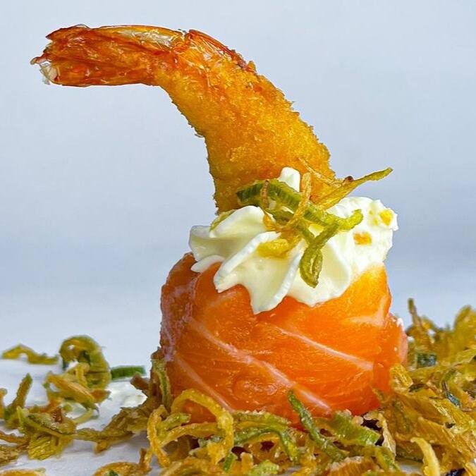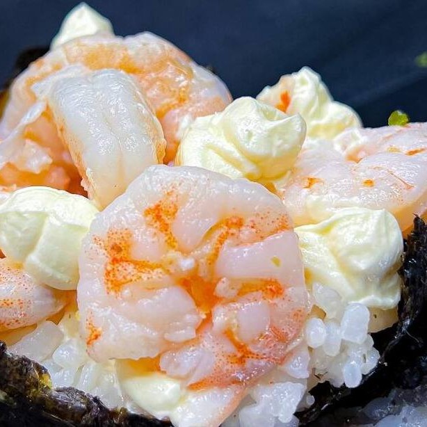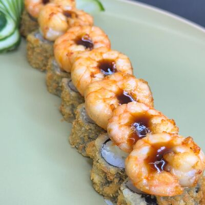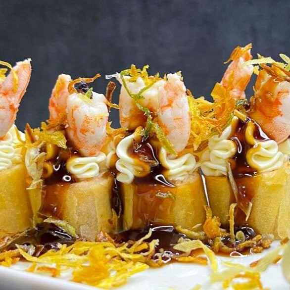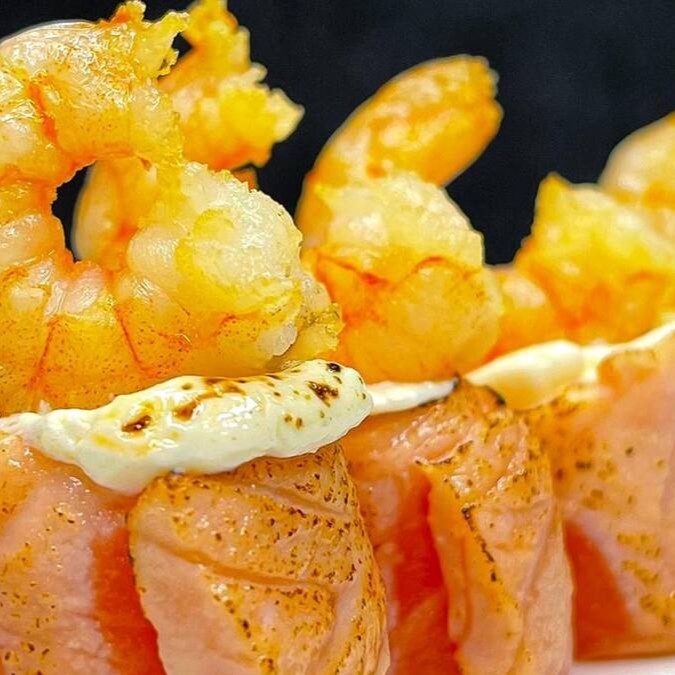 Makimono especial envolto em folha de harumaki crocante, recheado com pasta de salmão cremosa e sabor marcante. finalizado com um camarão inteiro por cima, teriaki e alho poró Porção com 10 unidades