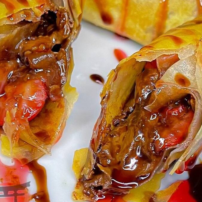 massa de harumaki, recheada de morango e chocolate