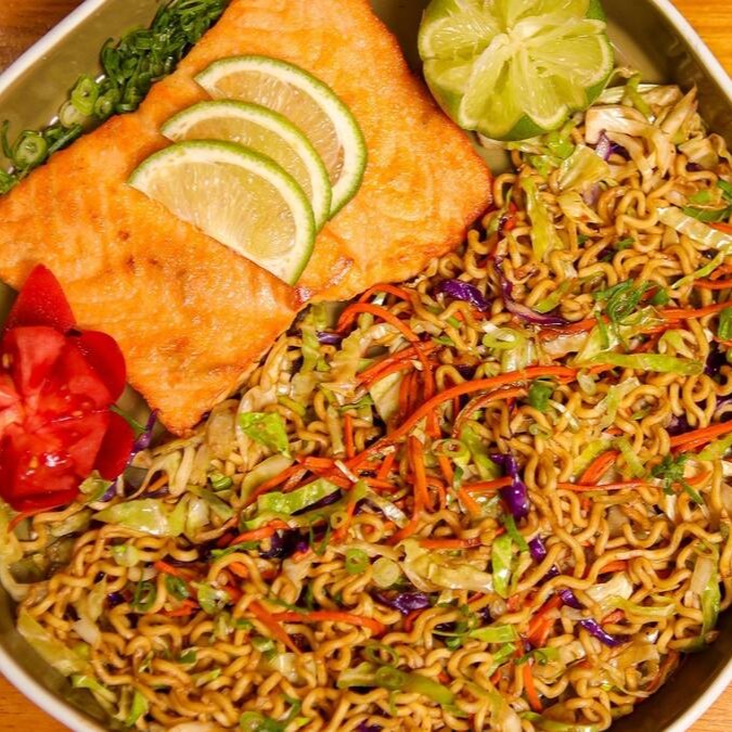 Posta de salmão grelhada no ponto, macia e saborosa, servida com yakisoba de legumes salteados ou arroz colorido. - posta com aproximadamente 180 gramas