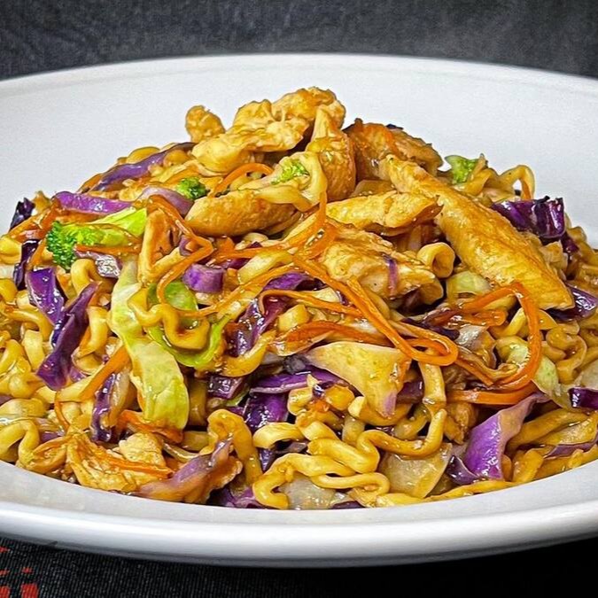 Macarrão japonês salteado com frango e legumes frescos, temperado na medida certa, leve, suculento e cheio de sabor. - peso aproximado exceto seja opção "sem vegetais"