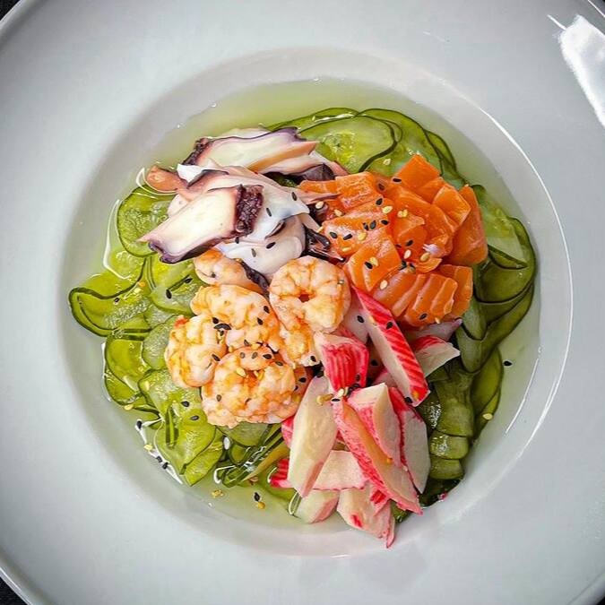 Salada japonesa de pepino ao molho agridoce de vinagre de arroz, com kani, camarão, polvo, salmão e gergelim. - peso aproximado 250 gramas