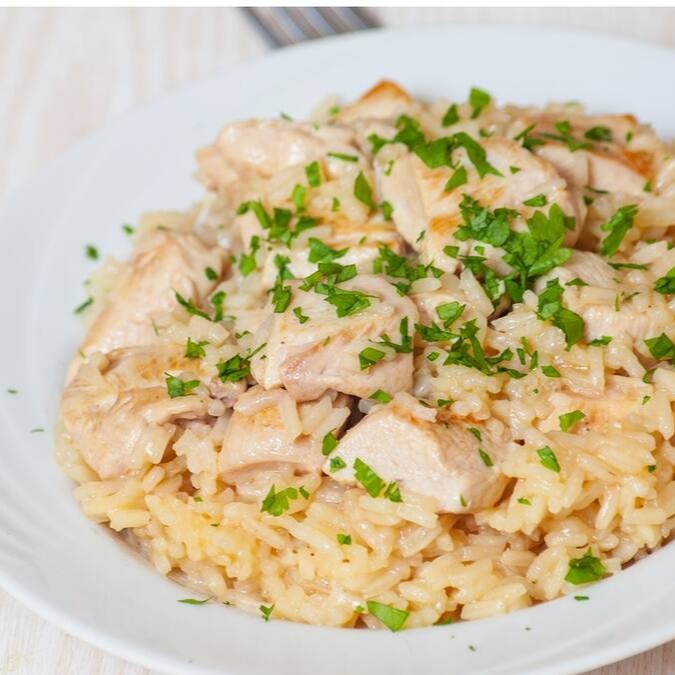 Risoto cremoso de frango, preparado com arroz, mussarela e manteiga, trazendo sabor marcante e textura irresistível. (imagem meramente ilustrativa)