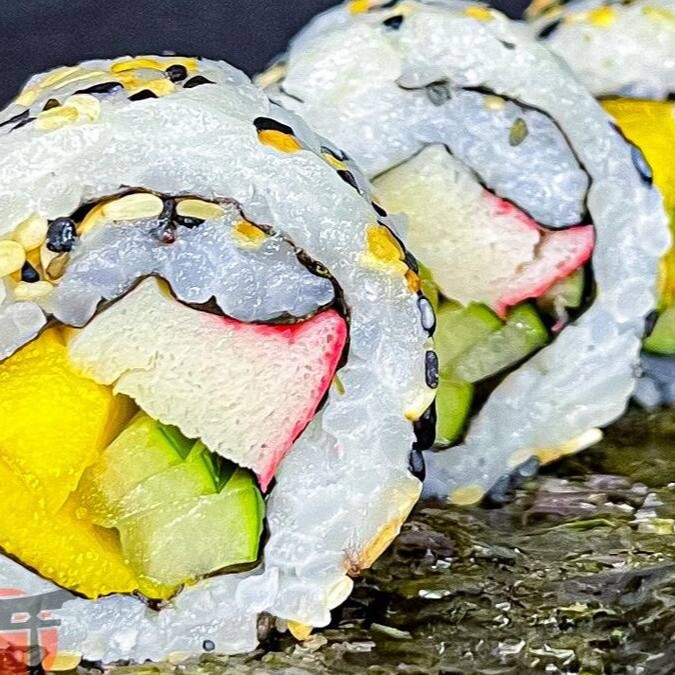 Makimono enrolado com arroz por fora e recheio de pepino, kani e manga e gergelin que realçam sabor e textura. - porção com 10 unidades Acompanha 2 molhos: teriaki e shoyu.