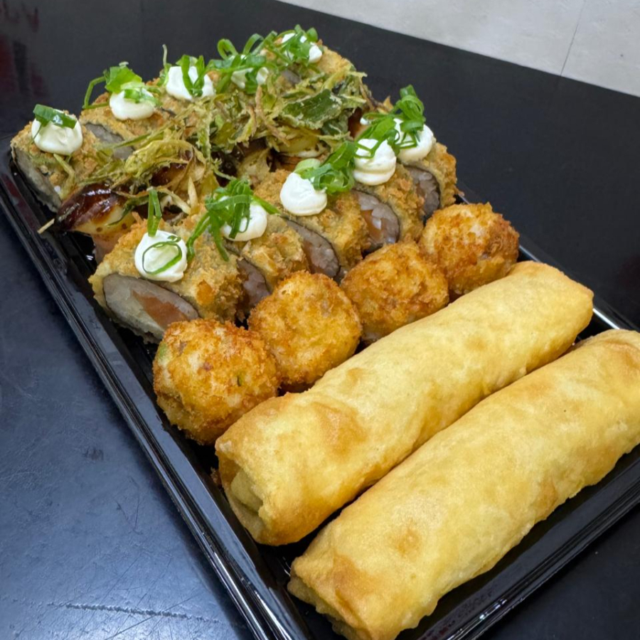 5 Sashimi Salmão, 5 Sashimi Atum, 5 Djoll Salmão, 6 Djoll Doritos, 5 Filadélfia, 2 Sushi Salmão, 2 Sushi Atum, 5 Haru Hot, 5 Hot Boston, 5 Skin Uramaki ,5 Hot Filadélfia. Acompanha 4 molhos: 2 Teriakis e 2 Shoyos.