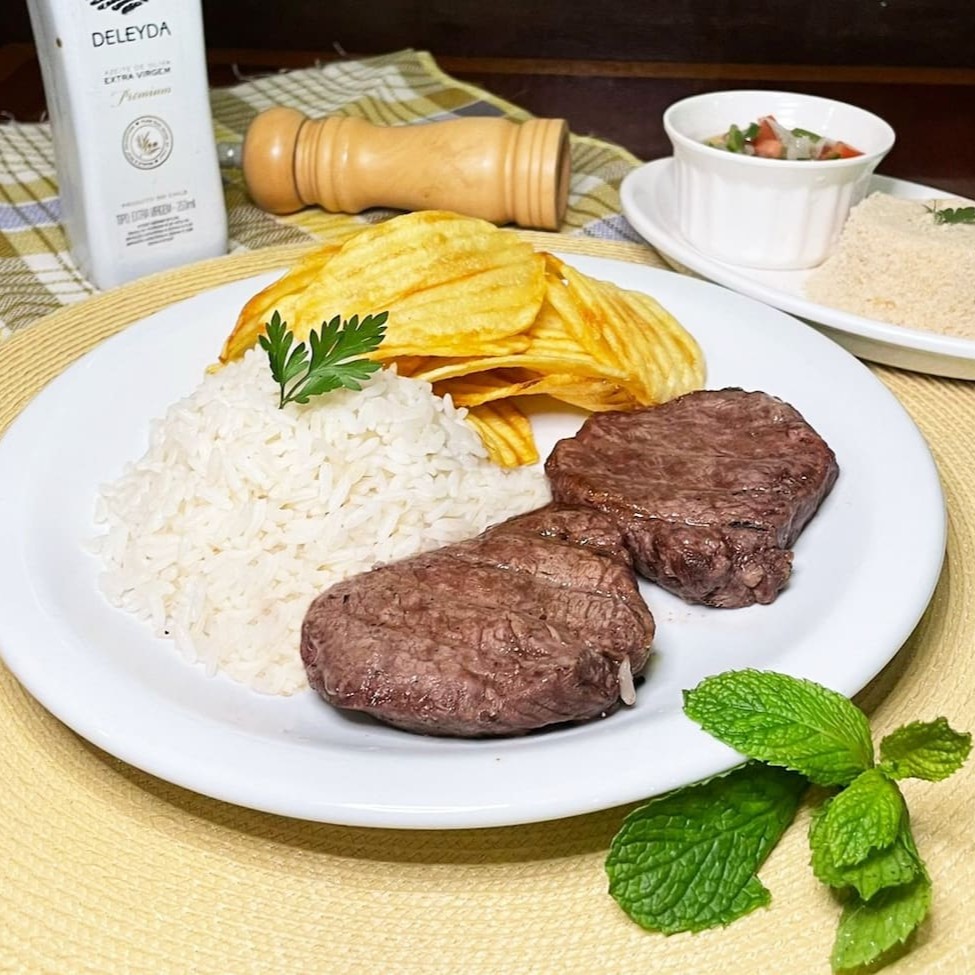 Cortes de Filé Mignon na Brasa, com batatas portuguesas, farofa e molho à campanha. Escolha seu Arroz. Prato Executivo.