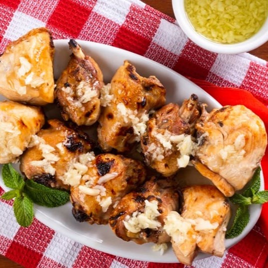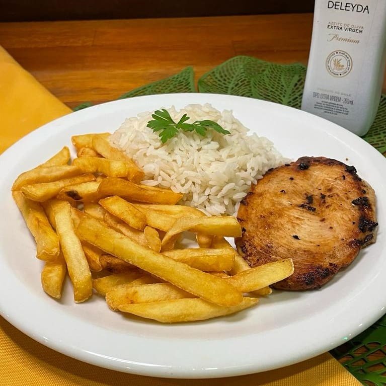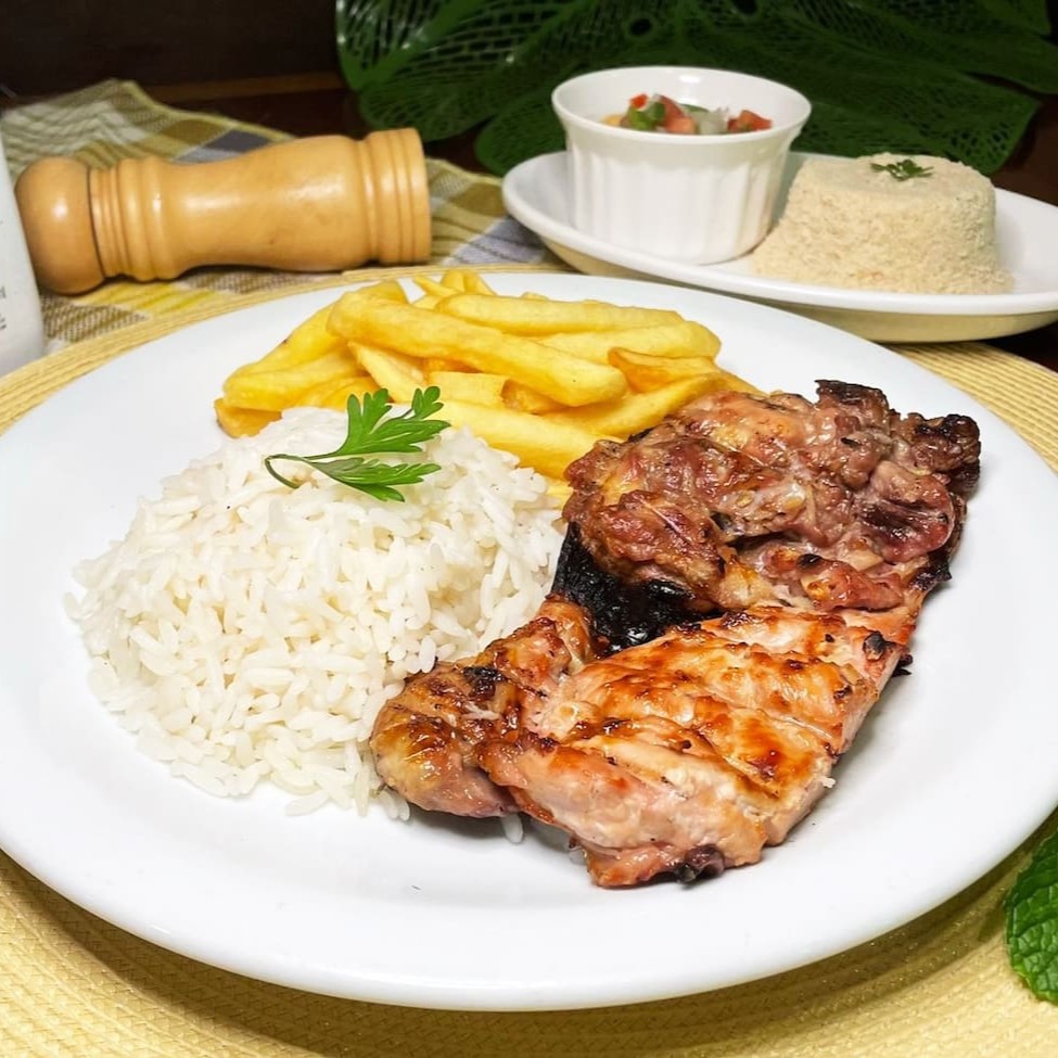 1/2 Galeto desossado na brasa, fritas, farofa e molho à campanha. Escolha seu Arroz. Prato Executivo.