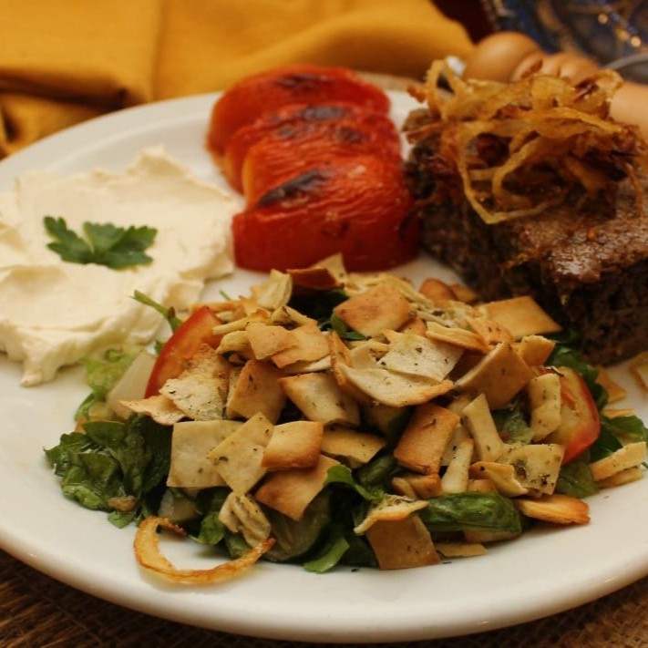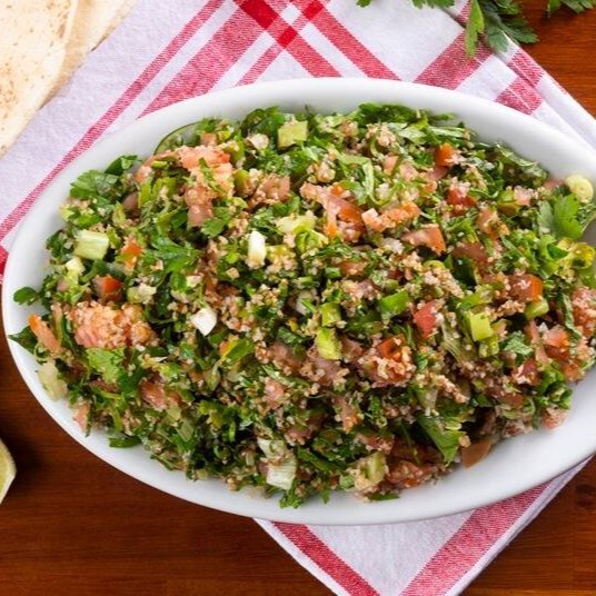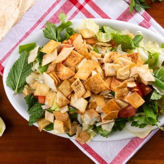 Tomate, Pepino, Alface, Cebola, Cebolinha, Hortelã, Salsa, Torradas de Pão Árabe e Molho de Romã.