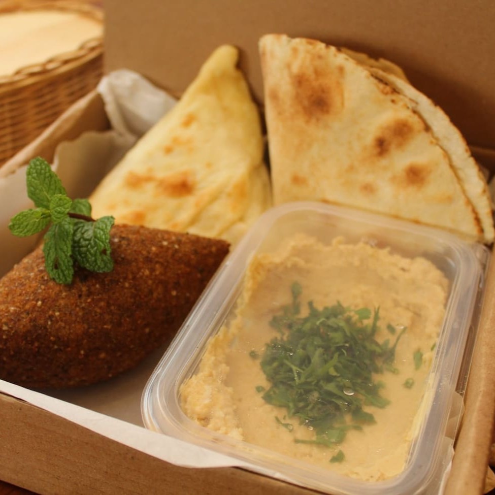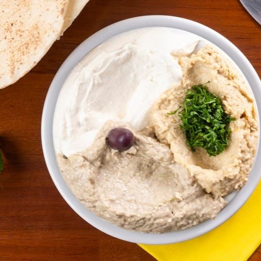Escolha 1 Pasta (Babaganuch, Coalhada Seca ou Homus Tahine), 1 Kafta de Carne + 2 Pães Árabes.
