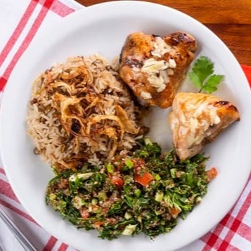 Frango na Brasa, Arroz com Lentilhas e Tabule. Prato Executivo.