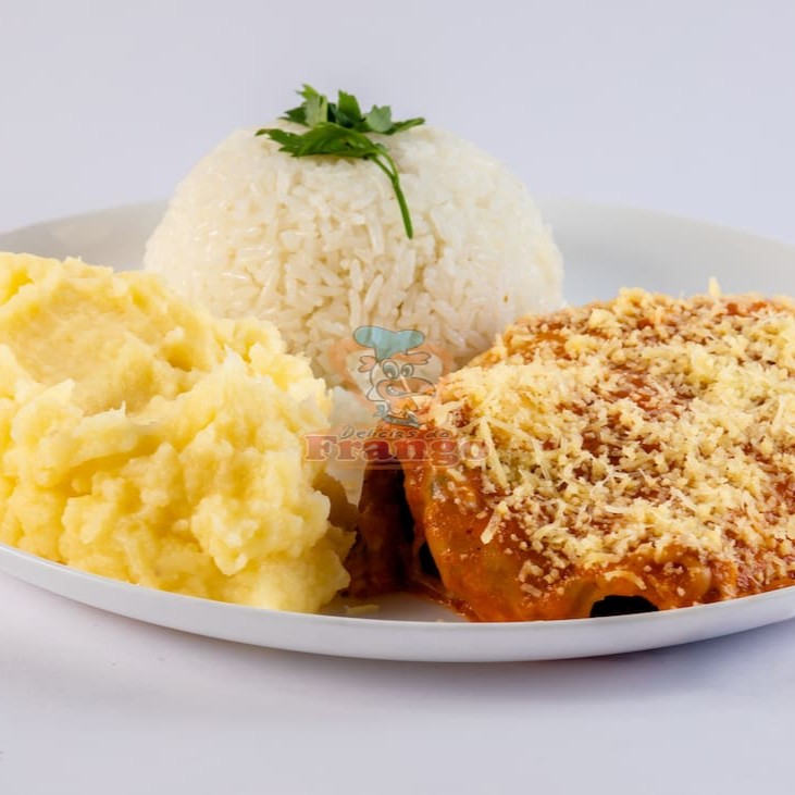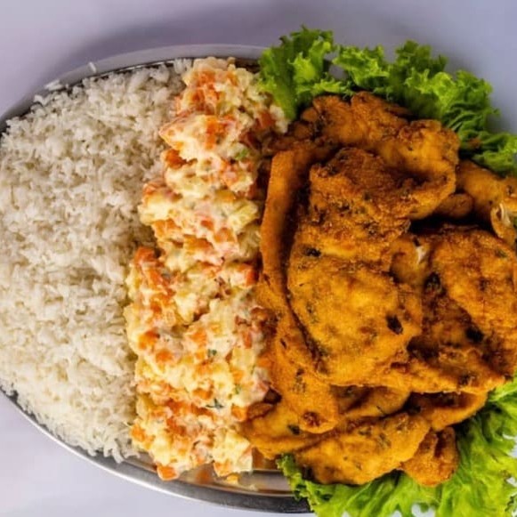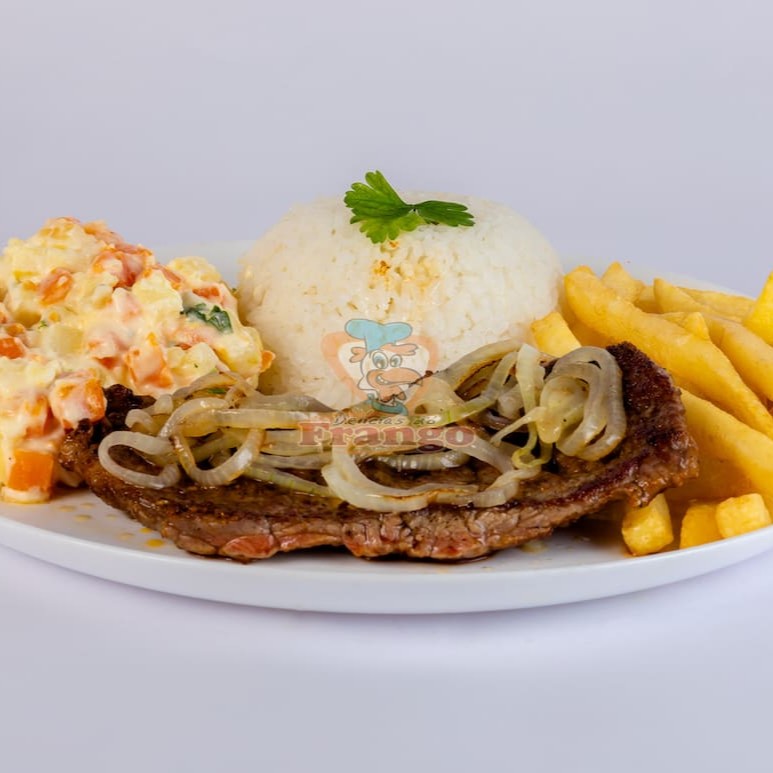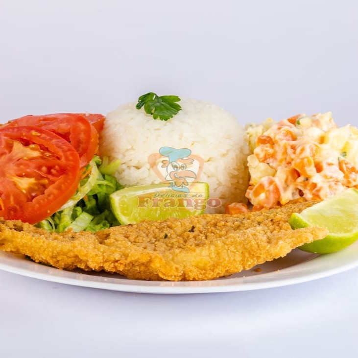 Acompanha arroz branco, batata frita, molho à campanha e farofa