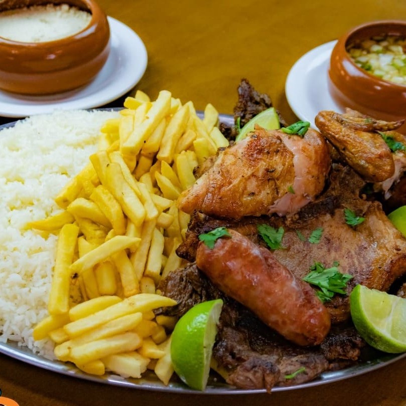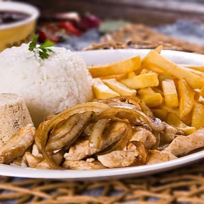Acompanha Arroz branco, Batata frita, Molho à campanha e Farofa