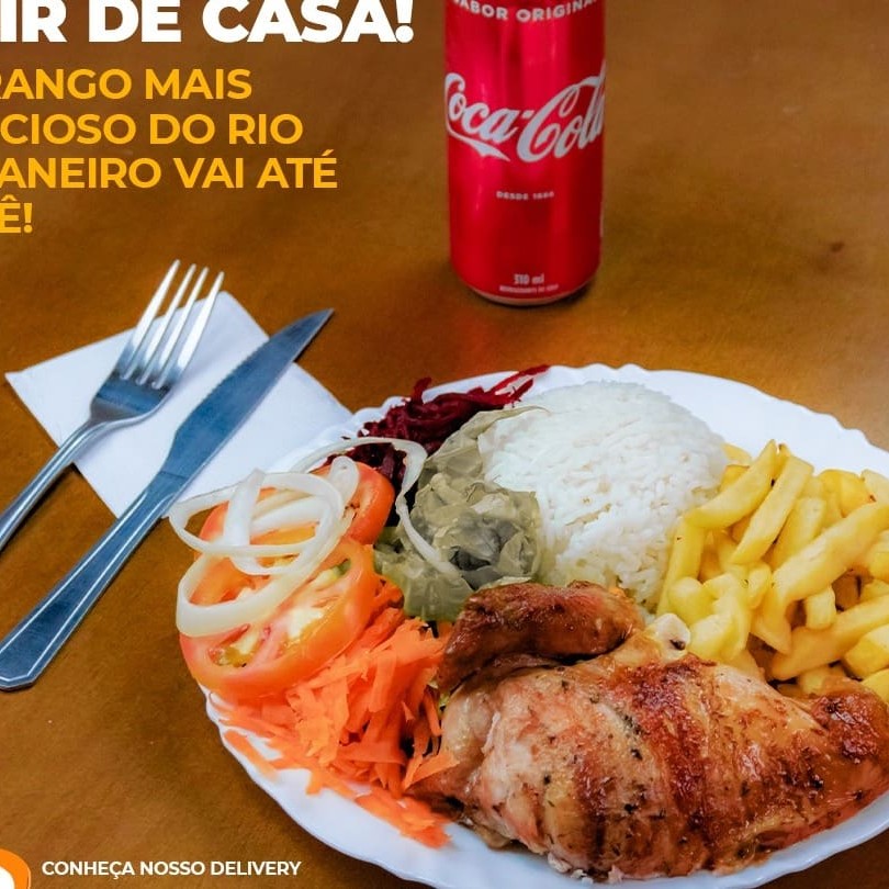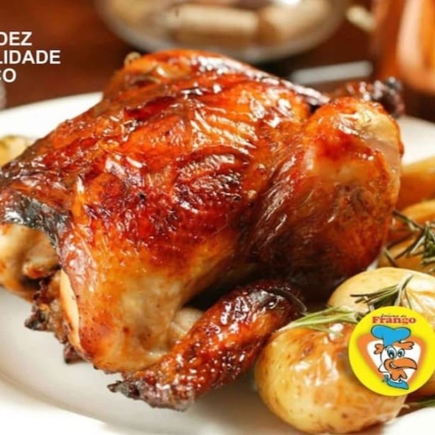 Delicioso frango assado (1,2kg); Acompanha Arroz branco (500g), Batata frita(300g), Molho à campanha (200ml) e Farofa(80g)