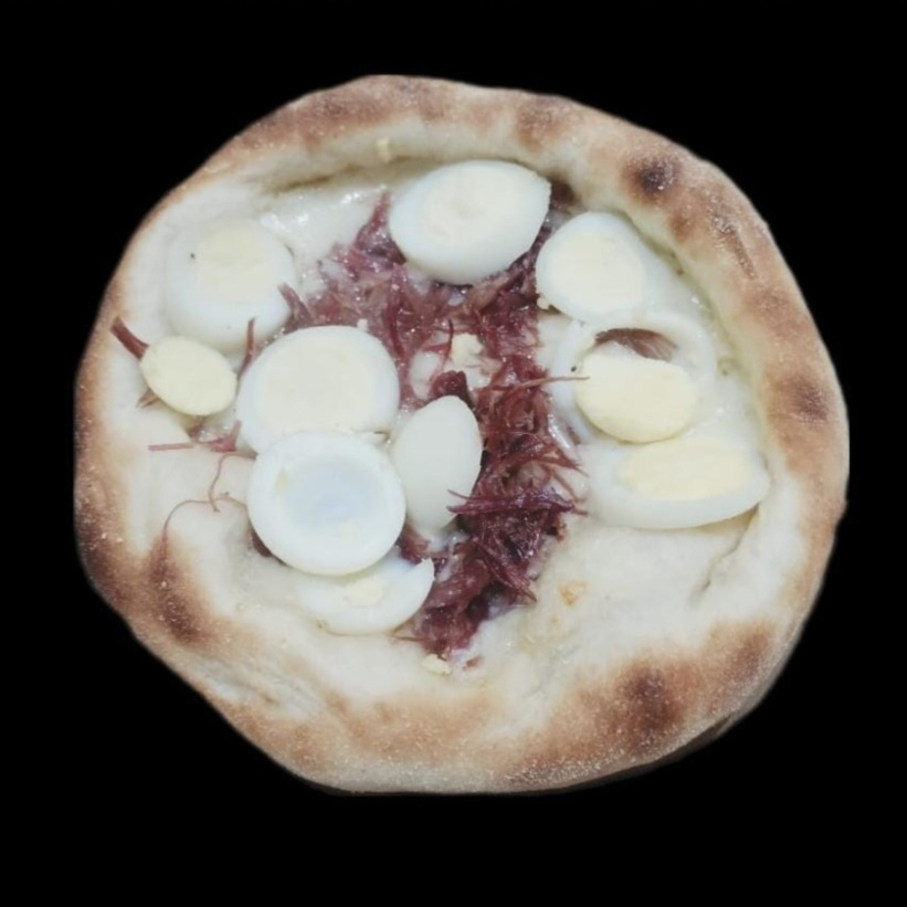 Muçarela,azeitona,cebola,oregano,pimentão,ovo de codorna e ervilha