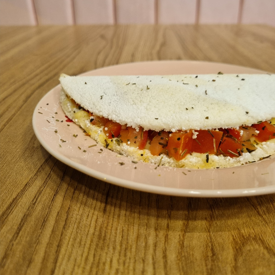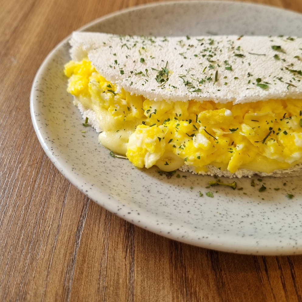 Tapioca recheada com frango desfiado e cremoso Catupiry, perfeita para um lanche rápido.