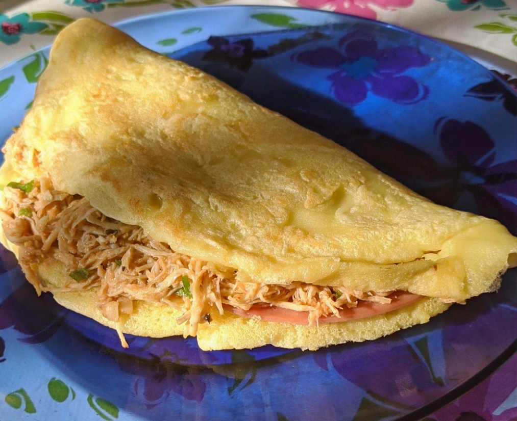 Tapioca recheada com frango desfiado e cremoso Catupiry, perfeita para um lanche rápido.