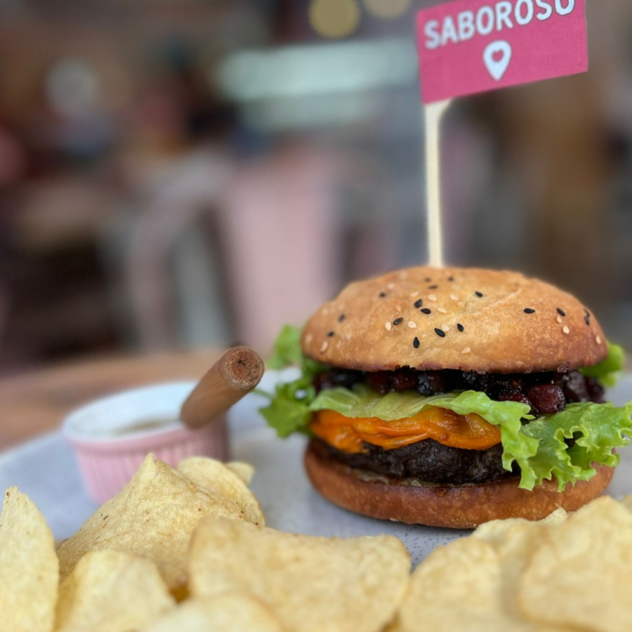 hamburgue artesanal carne de costela, queijo, geleia bacon batata,tomate,alface