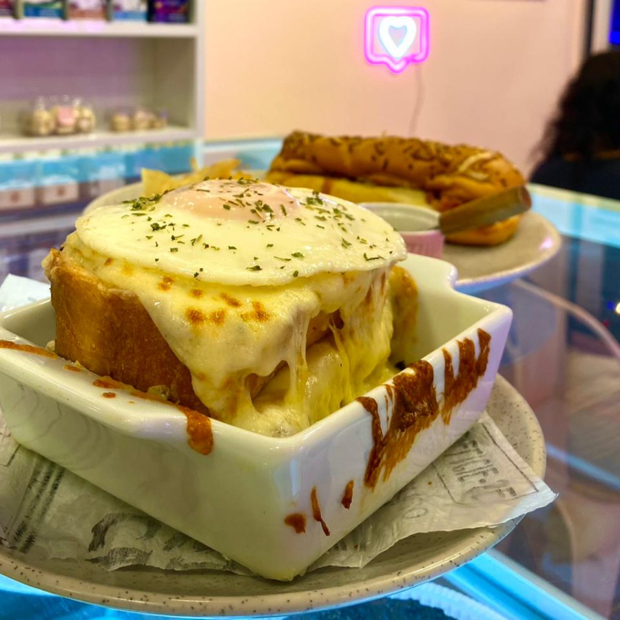 (Pão brioche amanteigado, ovo, presunto, requeijão, manteiga, molho bechamel e queijo gratinado Queijo Sant Paulin)