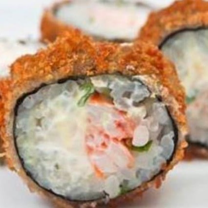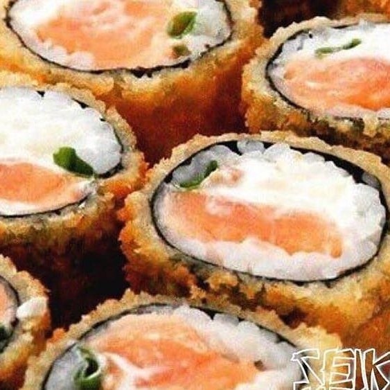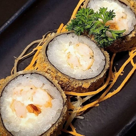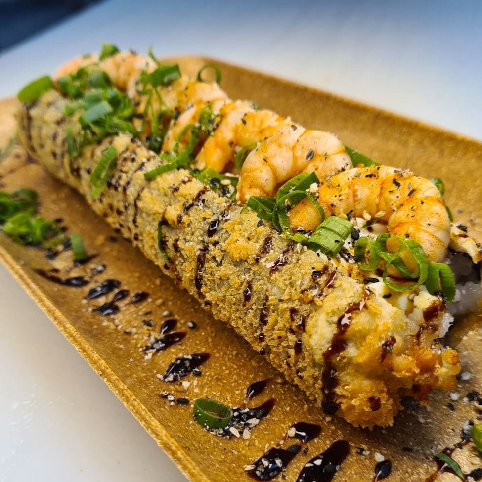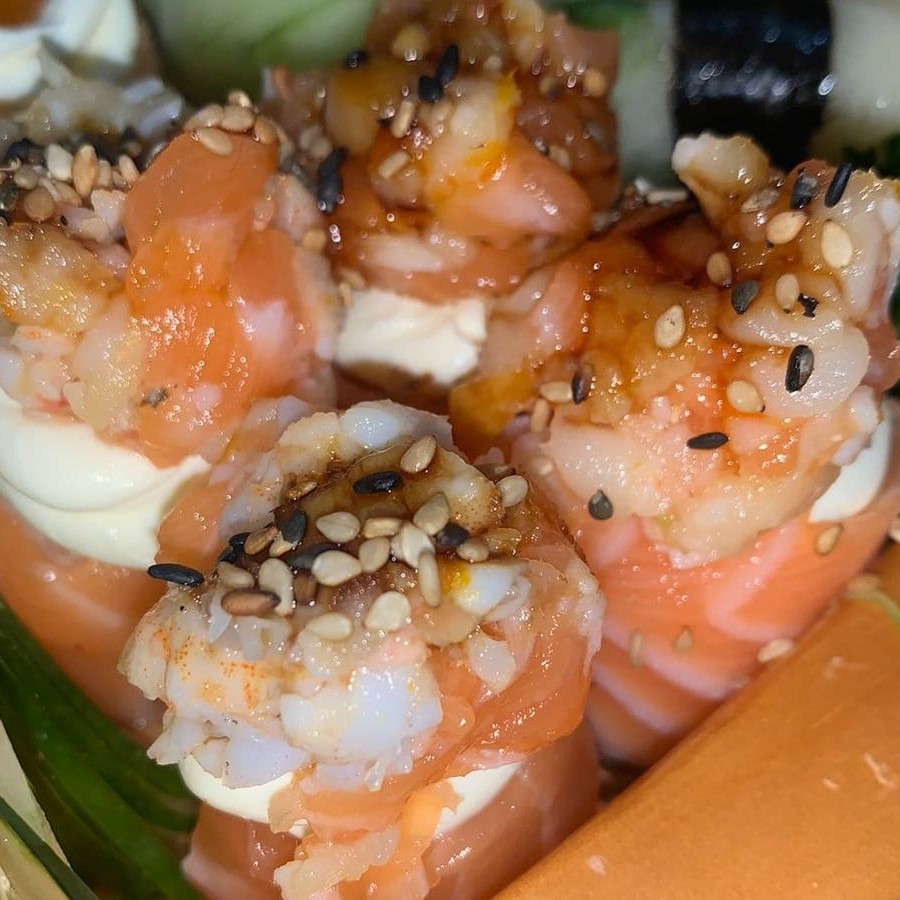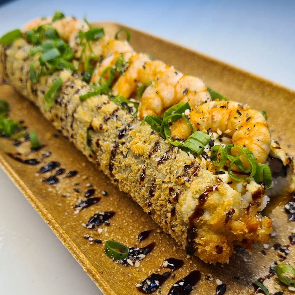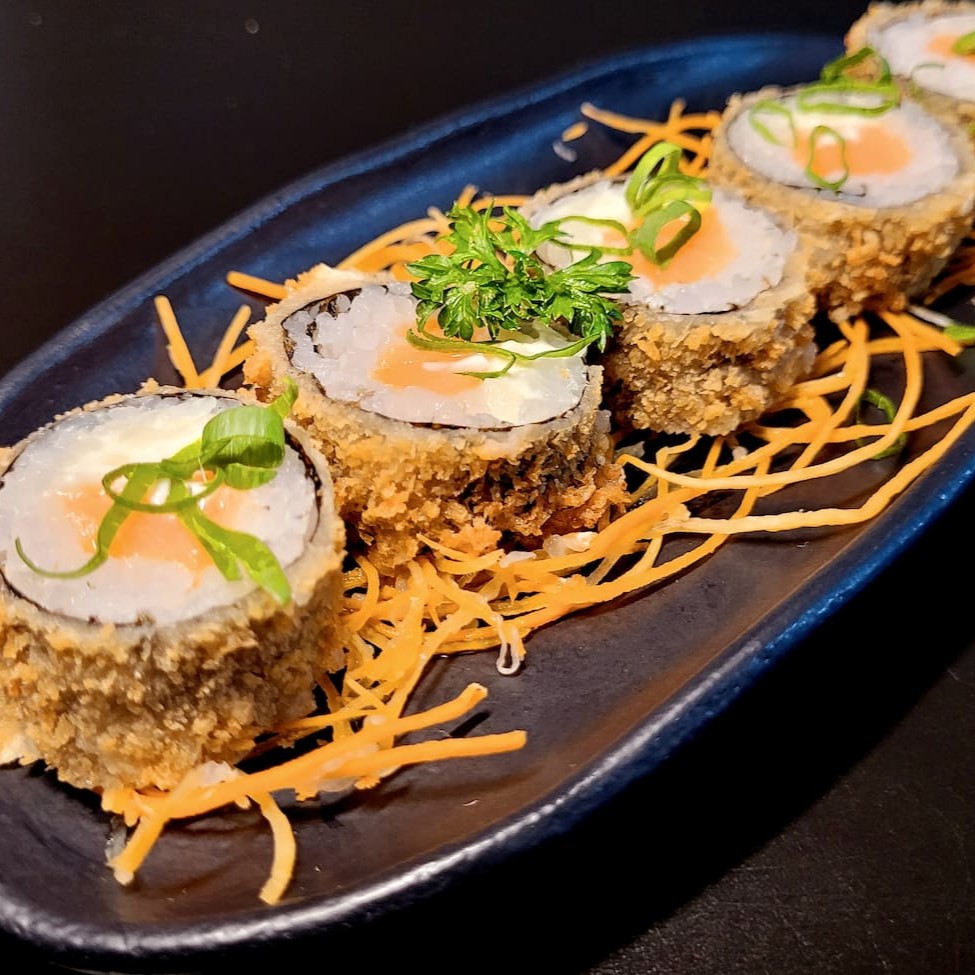 Enrolado de arroz empanado, cream cheese, salmão, camarão empanado, cebolinha, teriaki e gergelim