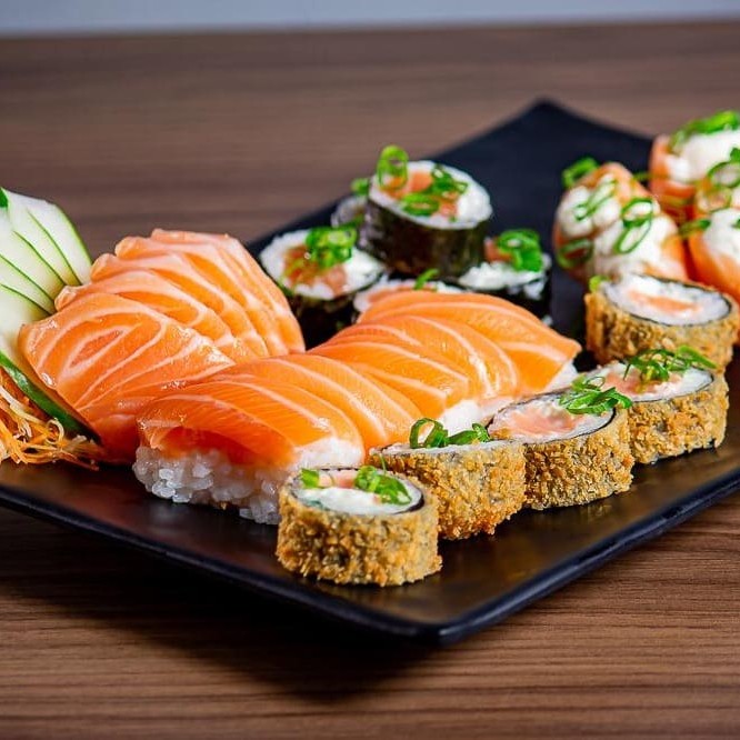 60 peças: 15 hot Philadelphia, 10 sashimi de salmão, 5 hot frutos, 5 sashimi de atum, 5 uramaki califórnia, 5 sushi de salmão, 5 sushi de camarão, 5 nikit san, 5 joe ebi.