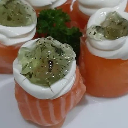 20 lâminas de salmão marinadas em molho especial finlizada com cebolas roxas.