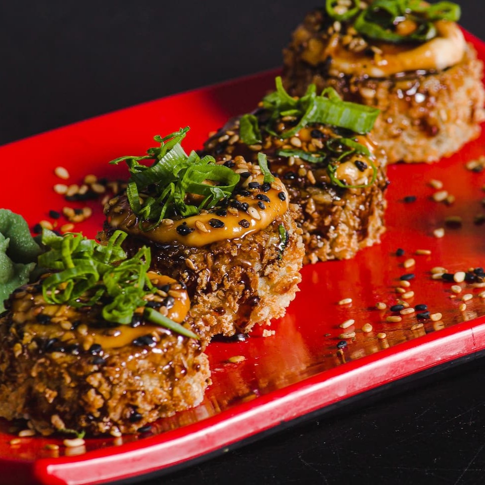 Enrolado de arroz empanado, cream cheese, atum, cebolinha, teriaki e gergelim