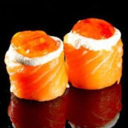 Arroz, salmão, cream cheese, cebolinha e finalizado com tartar de salmão.