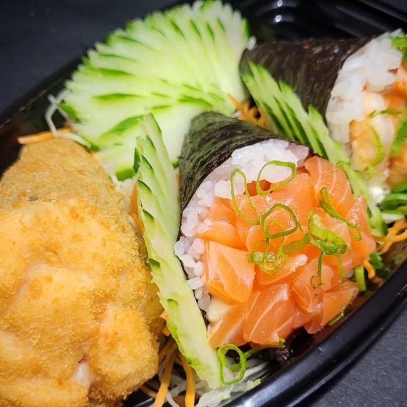 Temaki mix, Nori, arroz, cream cheese, haddock, camarão, salmão e cebolinha.