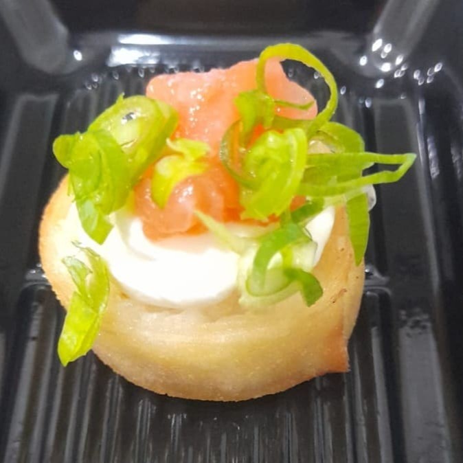 Crosta de gergelim, salmão, cream cheese e geléia de pimenta