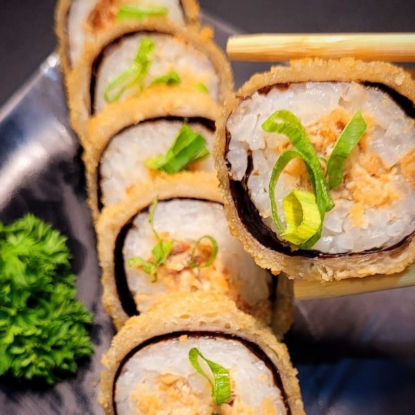 Temaki de atum e cream cheese, finalizado com cebolinha, empanado e frito