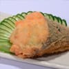 Corte de salmão empanado, recheado com camarões cortados, cream cheese e cebolinha.