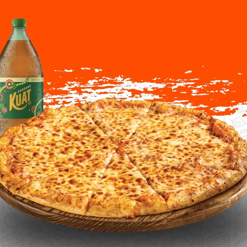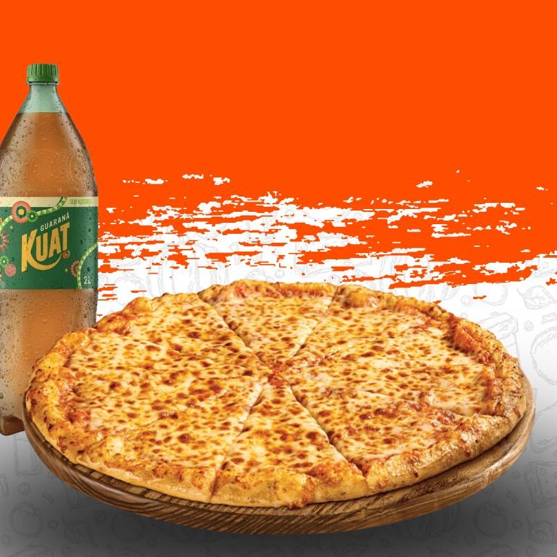 Classica, cremosa e perfeita para compartilhar! Nossa pizza família de mussarela tem 35cm, vem com 12 fatias bem servidas, coberta com mussarela derretida e orégano, além de uma irresistível borda de requeijão cremoso. Para completar o combo, ainda acompanha 1 refrigerante Kuat de 2 litros grátis!