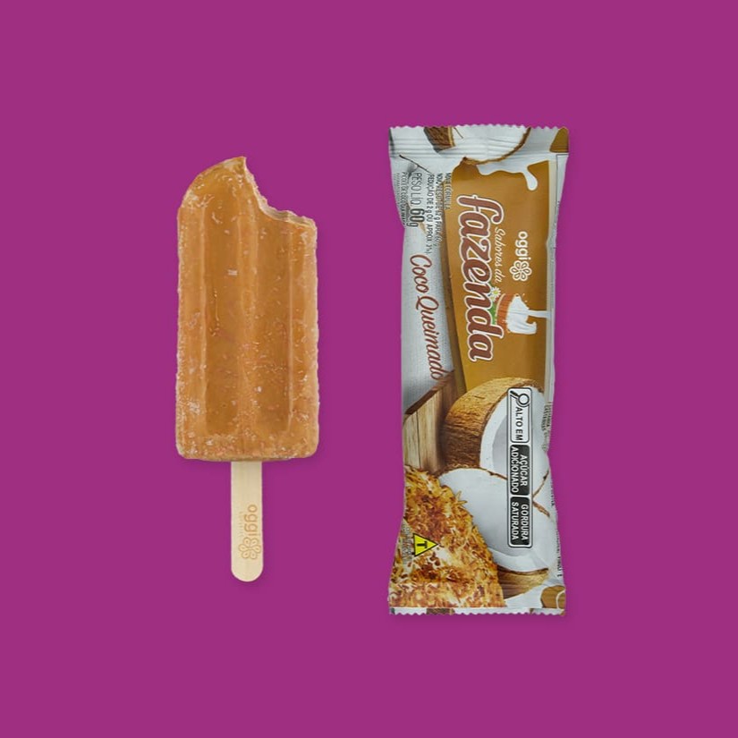 Coco queimado em forma de picolé, super delicioso. Alérgicos: Contém glúten, derivados de leite e soja. Pode conter derivados de castanhas