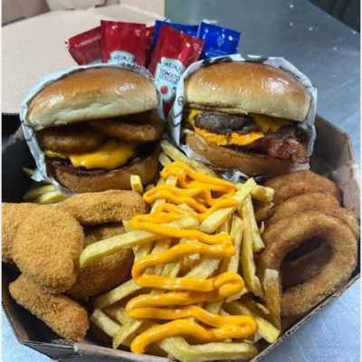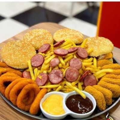 A solução definitiva para matar a fome da galera! Um combo gigante, com os lanches e porções que todo mundo ama, feito para dividir sem miséria. 4 Lanches Nº 1 (Duplo Cheddar) 1 Porção generosa de Batata com Cheddar, Bacon e Calabresa 15 Anéis de Cebola 15 Nuggets 1 Refrigerante de 2L
