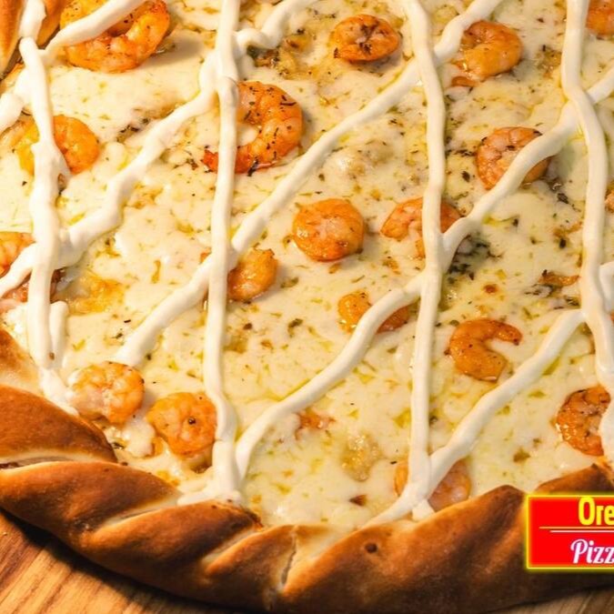 Molho, mussarela, orégano, camarão e cream cheese