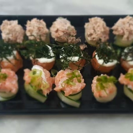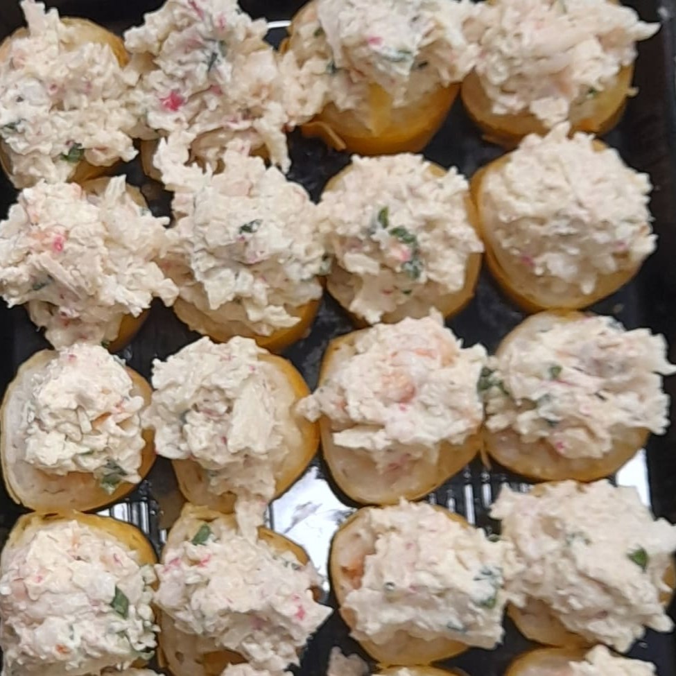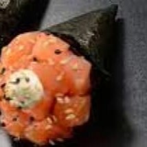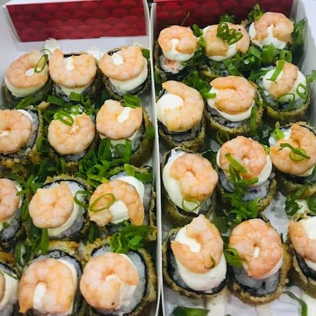 Casquinha de harumaki, salmão, cream cheese, mais pasta de salmão kani e camarão por cima.