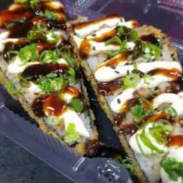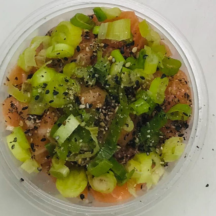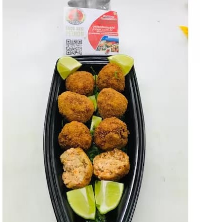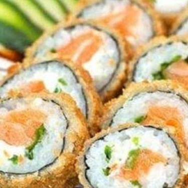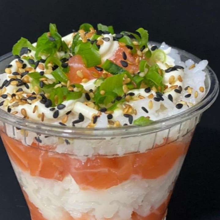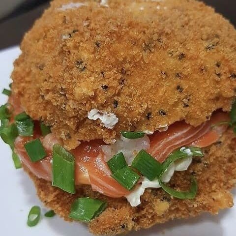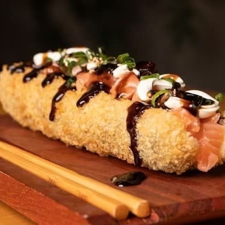 Arroz, Temperado, passado na farinha panco, Salmão, Cebolinha e gergelim, finalizado com Teriaky.