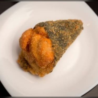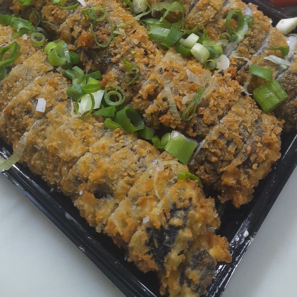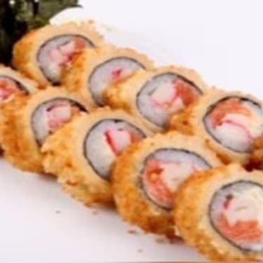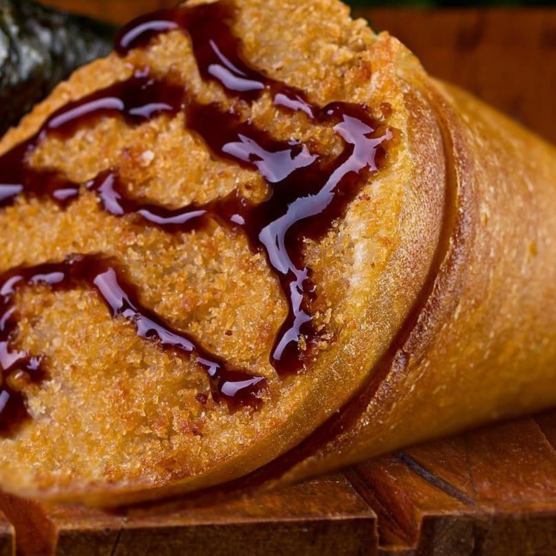 Alga, arroz temperado, salmão cream cheese, passado na faria panco.