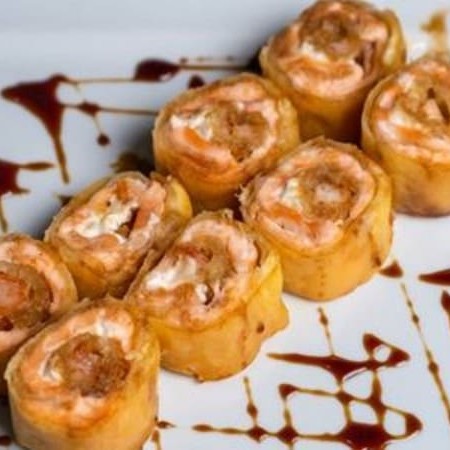 Casquinha de harumaki, salmão, cream cheese,