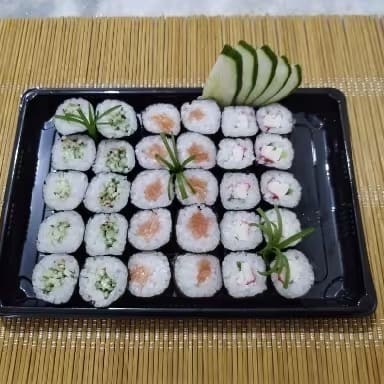 6 Uramaki salmão cru 6 Uramaki skin 5 Joe pepino 5 suhsi salmão 6 filadélfia pepino 6 Hot salmao