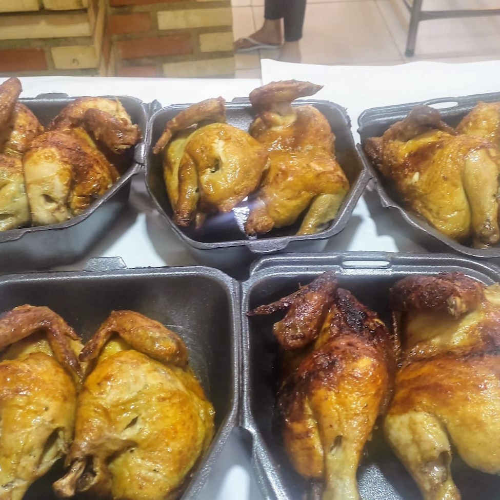 Saboroso frango assado na brasa, uma verdadeira assinatura da comida brasileira. Este delicioso prato é cuidadosamente preparado e marinado para garantir um sabor rico e suculento. Acompanha um tradicional molho à campanha, fresco e cheio de sabor, e a irresistível farofa, crocante e bem temperada. Uma combinação perfeita que promete agradar o seu paladar e levá-lo a uma autêntica experiência culinária brasileira.