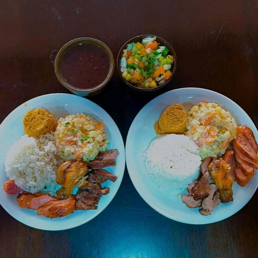 2 Refeiçoes De Churrasco Misto Arroz Feijão Salada De Maionese Farofa Vinagrete
