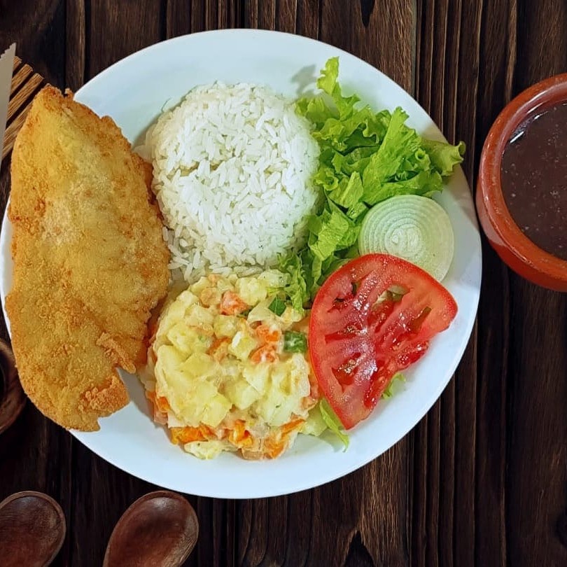 Filé de frango arroz feijão salada verde batata maionese ou batata frita