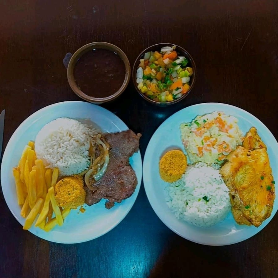 1 File C/ Fritas Arroz Feijao Batata Fritas E Farofa 1 File De Frango Grelhado Arroz Salada De Maionese Feijao Farofa