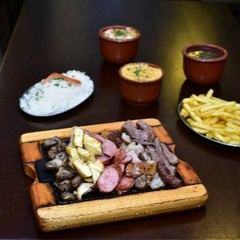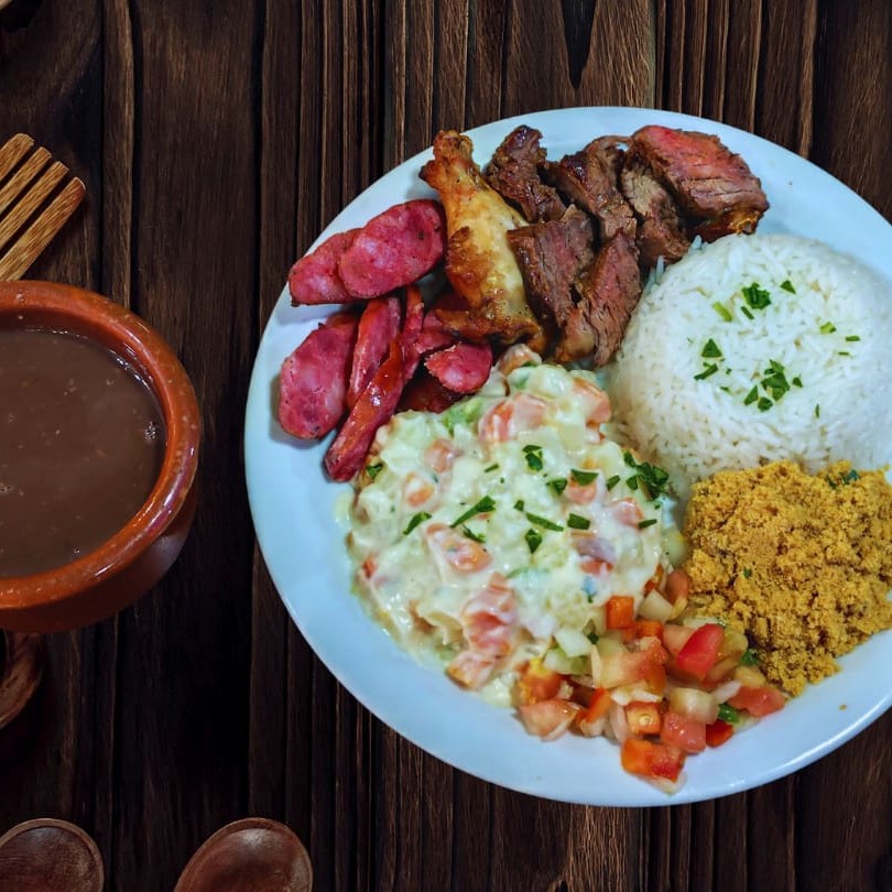 Contra filé , linguiça de pernil , picanha suína, tulipa das asas, coração, queijo qualho Arroz ,feijão , farofa , batata frita, molho acampanha serve ate 6 pessoas