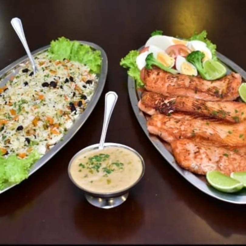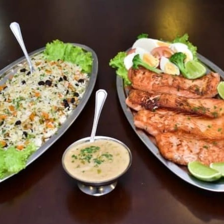 Serve até 3 pessoas Salmão ao molho maracujá, arroz branco , salada verde c/ palmito