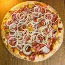 Molho de tomate, mussarela, linguiça calabresa e cebola.