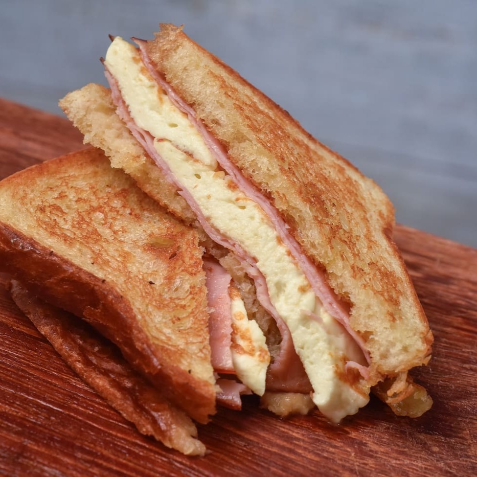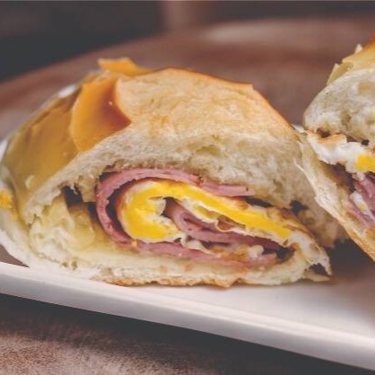 O clássico pão da casa, saboroso sanduíche. Queijo prato, presunto e ovo frito.