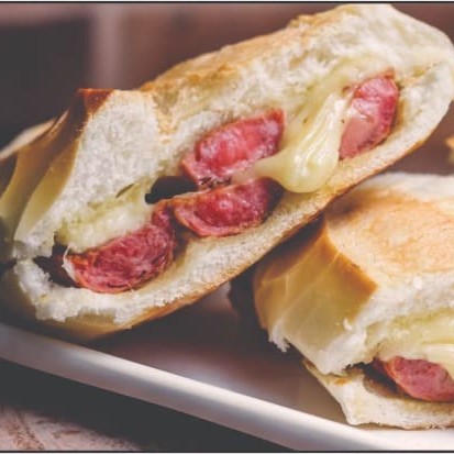 O clássico pão da casa, saboroso sanduíche de porção de linguiça defumada.