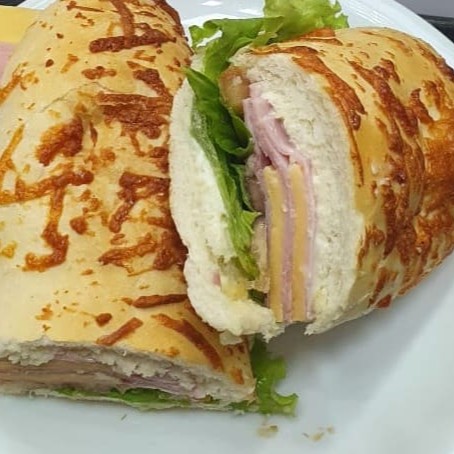 Delicioso sanduiche baguete de provolone com queijo prato, presunto e alface, sobre uma generosa camada de requeijão.