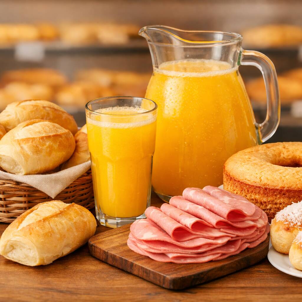 Não falta nada. Não sobra nada. Combo completo, bem montado, para qualquer horário. 10 pães francês, 200g de mortadela Comum, um Bolo caseiro e 1 suco 1l laranja ou uva.